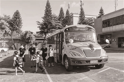 为持续改善空气质量,禅城区推行了共享校车、工地油品直供等措施。图为孩子们乘坐共享校车到达学校。