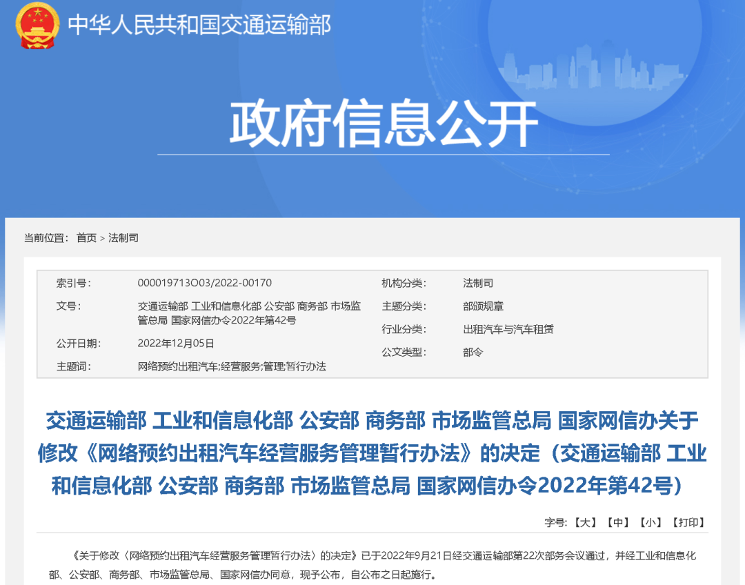 近日,交通运输部、工业和信息化部、公安部、商务部、市场监管总局、国家网信办公布关于修改《网络预约出租汽车经营服务管理暂行办法》的决定,对未取得网络预约出租汽车运输证、驾驶员证从事网约车经营活动等行为的罚款数额予以下调。