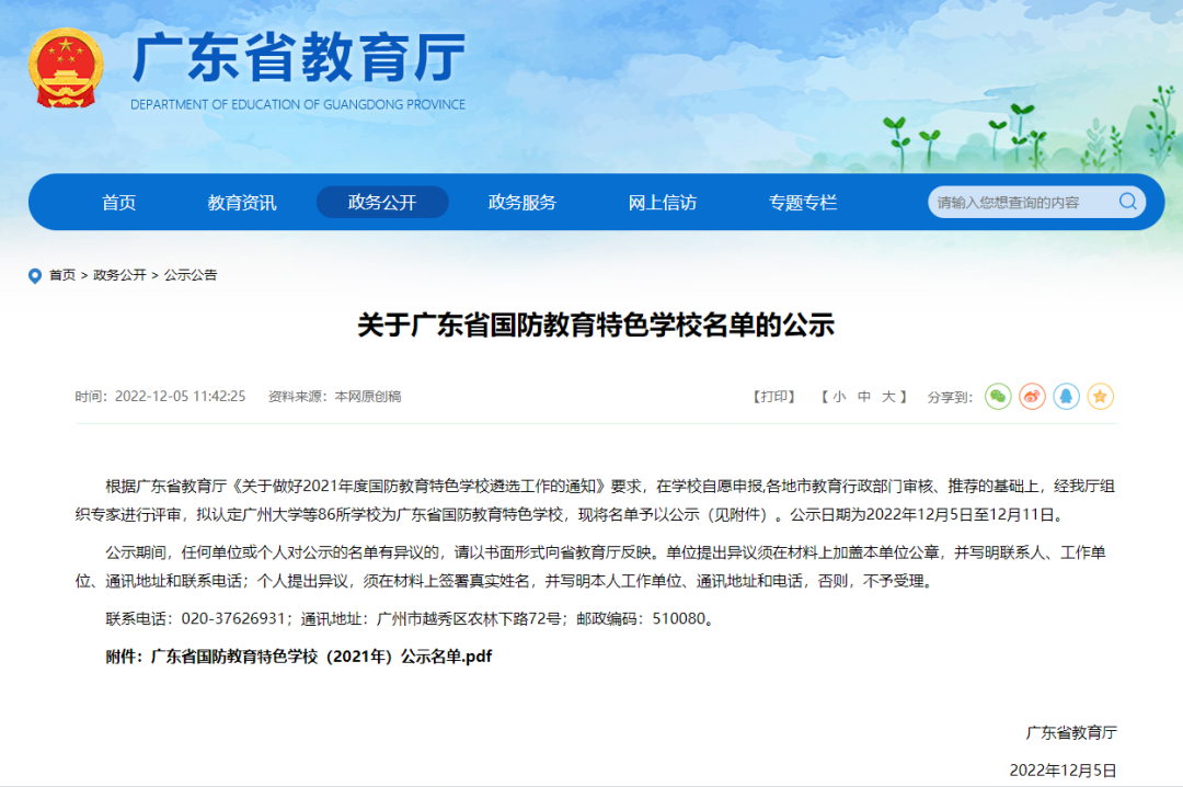 12月5日,广东省教育厅发布了关于广东省国防教育特色学校名单的公示。在学校自愿申报,各地市教育行政部门审核、推荐的基础上,经省教育厅组织专家进行评审,拟认定86所学校为广东省国防教育特色学校。