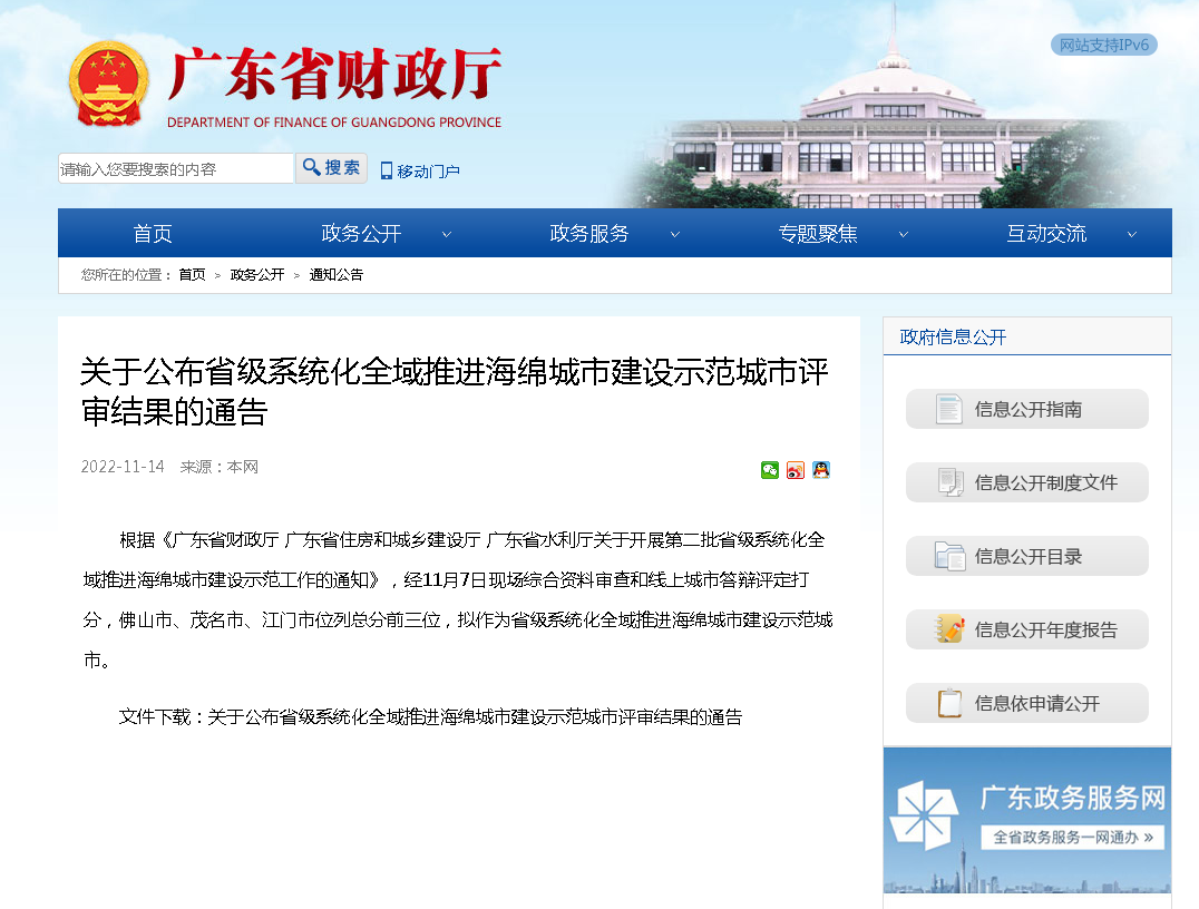根据广东省财政厅的通告,经现场综合资料审查和线上城市答辩评定打分,佛山市通过省财政厅、省住建厅、省水利厅组织的竞争性答辩,以总分第一的优异成绩当选为广东省第二批省级系统化全域推进海绵城市建设示范城市。