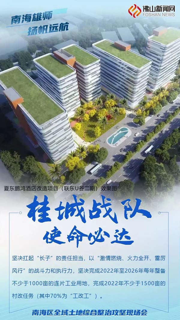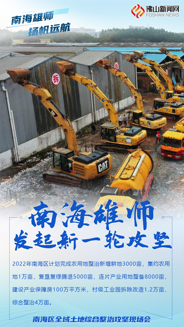 2021年11月23日,南海在大沥举行全域土地综合整治誓师大会,正式打响了全域土地综合整治第一炮,相继成立的桂城战队、九江战龙、西樵尖兵、丹灶先锋、狮山雄狮、大沥铁军、里水突击队活跃在全域土地综合整治工作的最前沿。
