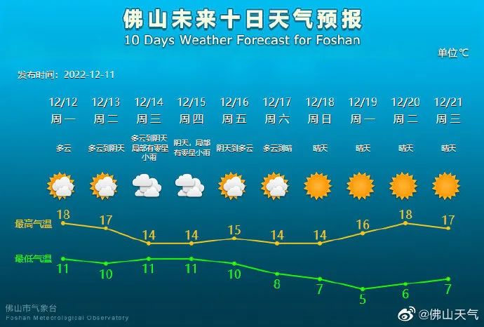 据佛山市气象台预报,未来一周冷空气活动频繁,北风清劲,天气寒冷。预计今日(12月12日)冷空气继续补充,佛山多云为主,北风3-4级、并伴有6级左右阵风;明日(12月13日)多云到阴天,风力减弱;展望12月14到15日阴天为主,局部有零星小雨,日温差小。本周周日最低气温或降至7℃。