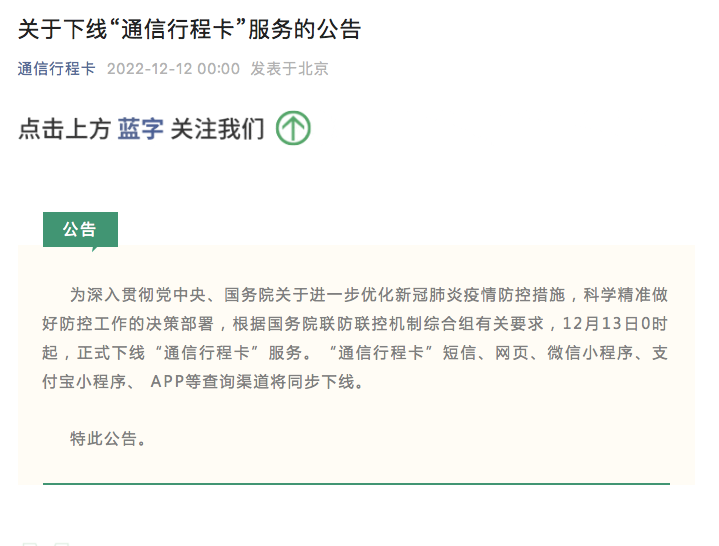 “通信行程卡”12月13日0时起正式下线 根据国务院联防联控机制综合组有关要求,12月13日0时起,正式下线“通信行程卡”服务。