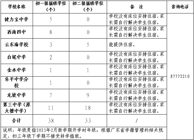 无学位的学校,不安排插班,也不接受申请登记。已申请了插班,但因申请人数超出插班学位数而无法录取的学生需回原校就读,三水区教育局不再协调安排插班。