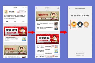 通过关注“禅城教育”微信公众号(微信号:fs_ccjy)→底部子菜单的“招生专栏”→选择“招生报名查询”,进入“佛山市禅城区招生系统”→点击“小学招生”。