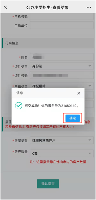 (3)认真检查填写信息,信息确认无误后点击“确认提交”,系统显示提交成功,然后点击“确定”。
