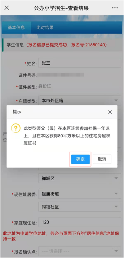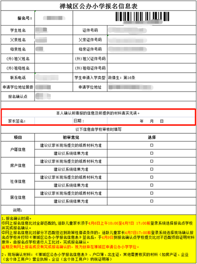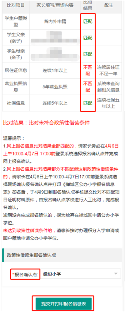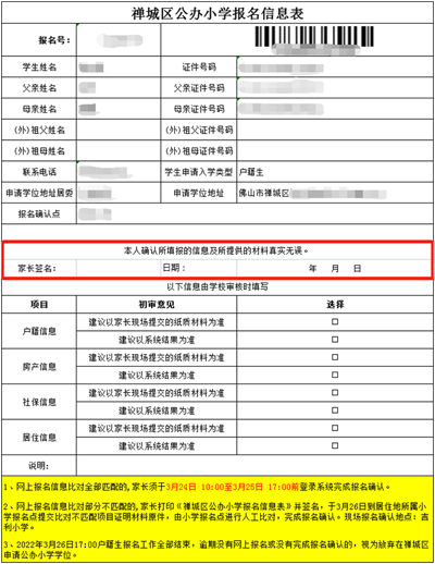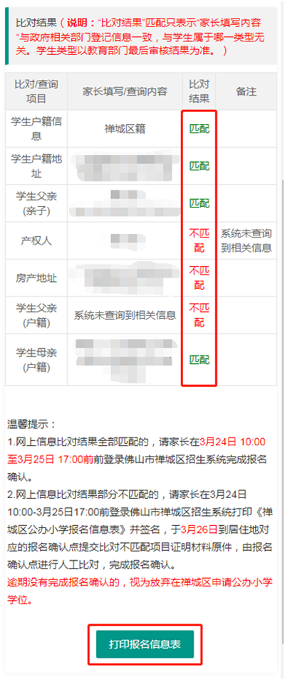 (2)户籍生网上信息比对结果部分不匹配的,适龄儿童家长须于3月24日10:00-3月25日17:00前登录佛山市禅城区招生系统打印《禅城区公办小学报名信息表》并签名,于3月26日到居住地对应的报名确认点提交比对不匹配项目证明材料原件,由报名确认点进行人工比对,完成现场报名确认。