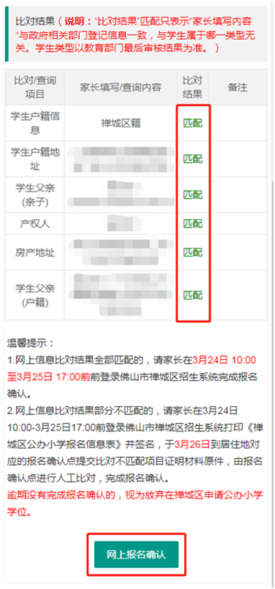 网上报名信息比对部分不匹配的,适龄儿童家长于3月24日10:00-3月25日17:00前登录系统打印《禅城区公办小学报名信息表》并签名,于3月26日到居住地对应的报名确认点提交比对不匹配项目证明材料原件,由报名确认点进行人工比对,完成现场报名确认。