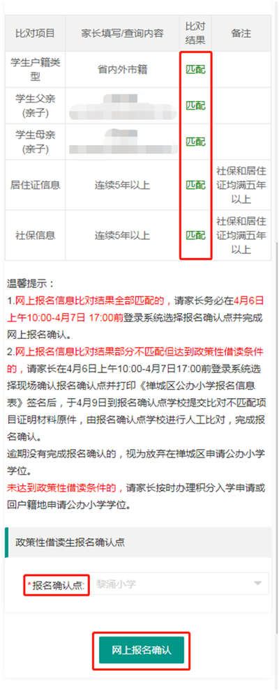 网上报名信息比对全部匹配的,适龄儿童家长须于4月6日10:00-4月7日17:00前登录系统完成“网上报名确认”;