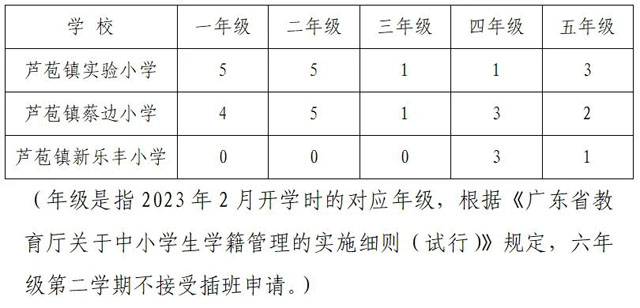 根据《三水区教育局关于进一步规范招生和学籍管理工作的通知》和《关于做好义务教育阶段转学插班工作的通知》的文件要求,我镇公办小学在2023年春季招收一至五年级插班学生。现将各学校招收插班生学位数、报名条件及申请办理手续予以公布: