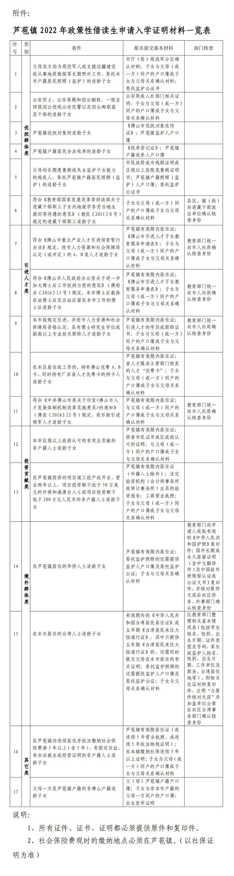 附件:《芦苞镇2022年政策性借读生申请入学证明材料一览表》