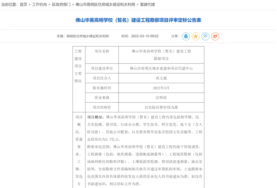3月10日,高明区住房城乡建设和水利局发布《佛山华英高明学校(暂名)建设工程勘察项目评审定标公告表》的公告。