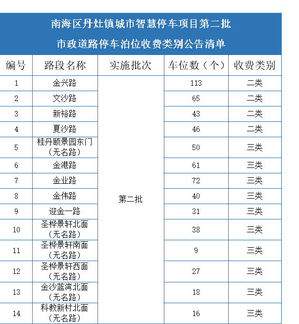南海区丹灶镇城市智慧停车项目第二批市政道路停车泊位收费类别公告清单