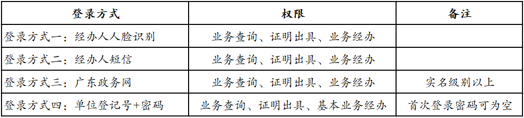 已开通网上服务的单位,经办人通过人脸识别、短信或广东政务服务网账号进入单位版网厅可全方位进行查询、办理业务;通过单位登记号、密码方式登录仅可进行查询、基本业务经办(单位汇缴、网上服务管理、大湾区授权)和证明出具业务。