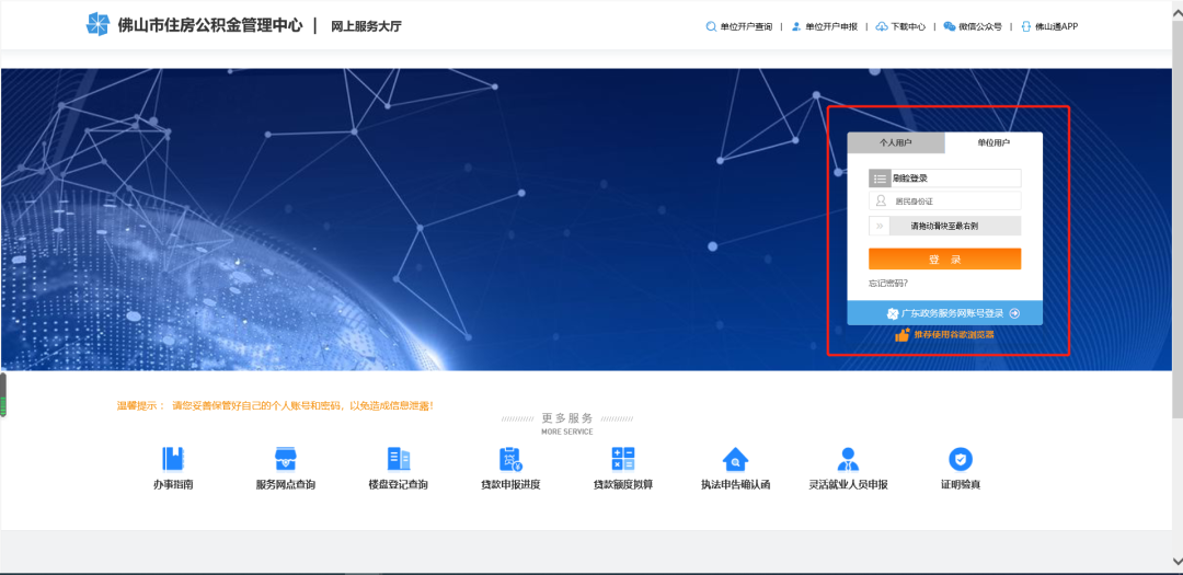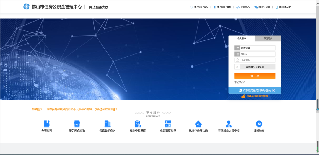 1、 登陆佛山市住房公积金管理中心网站(http://fsgjj.foshan.gov.cn),点击个人网办事大厅入口,进入管理中心网上服务大厅选择“个人用户”,然后选择登录方式进行登录。