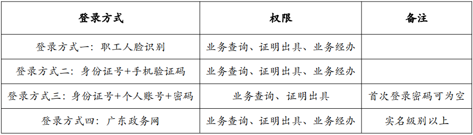 职工通过人脸识别、手机验证码或广东政务服务网账号登录进入个人版网厅可全方位进行查询、办理业务;通过身份证号+个人账号+密码的方式登录个人网厅仅可进行查询和证明出具业务。