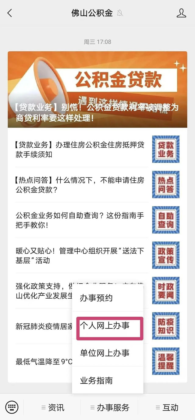 1、关注“佛山公积金”微信公众号,菜单栏点击“办事服务”,选择“个人网上办事”;