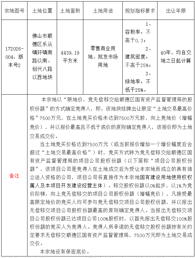 经佛山市顺德区人民政府批准,佛山市自然资源局顺德分局委托佛山市顺德区公共资源交易中心以“限地价,竞无偿移交给顺德区国有资产监督管理局的股权份额”的方式现场挂牌竞买出让下列地块的国有建设用地使用权,现将公开挂牌竞买的有关事宜公告如下: