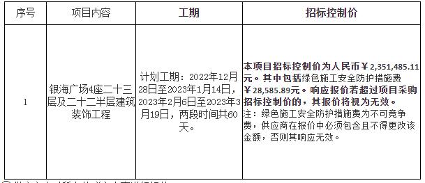 1、标的名称:银海广场4座二十三层及二十二半层建筑装饰工程