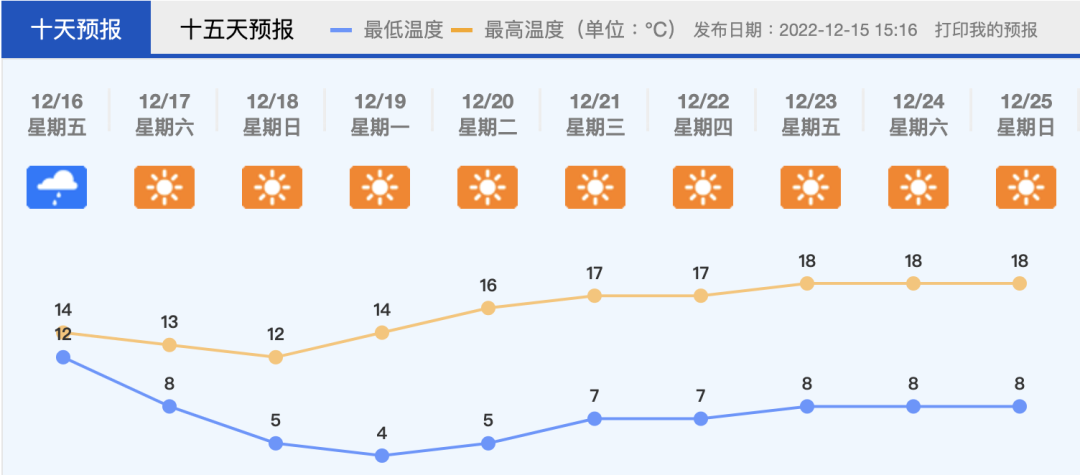 12月16日:阴天到多云,12~14°C,偏北风3~4级,阵风6级左右;