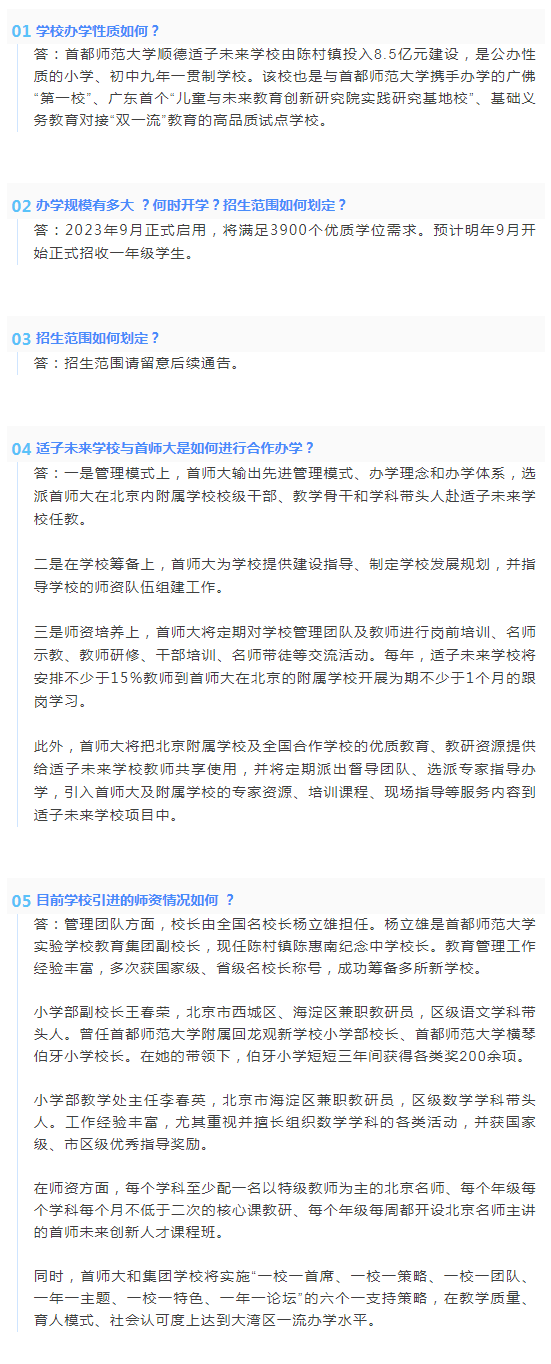 “顺德高度重视教育的发展,陈村对教育关注和热忱让人钦佩。”仪式上,中国科学院院士、首都师范大学校长方复全在发言中表示,首师大已经为适子未来学校选定了高水平的校长和骨干团队,将全力把学校建设为学生全面发展、教师队伍专业、人民满意的示范学校。