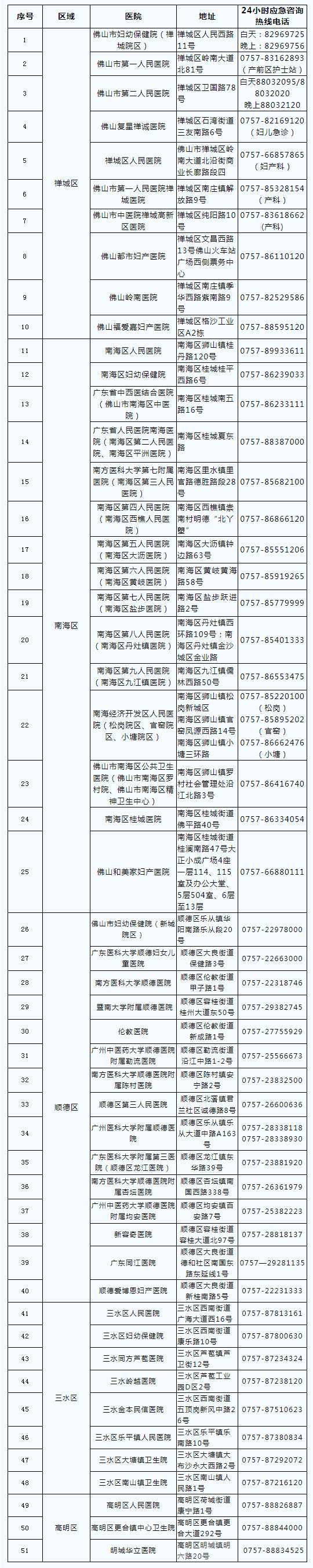 为进一步做好新冠肺炎疫情防控新阶段孕产妇和新生儿医疗服务保障工作,切实保障母婴安全,现公布佛山市各助产机构名单及24小时应急咨询热线,提供孕产期的健康管理咨询、健康指导服务,引导孕产妇有效合理就医及住院分娩,舒缓群众心理压力。