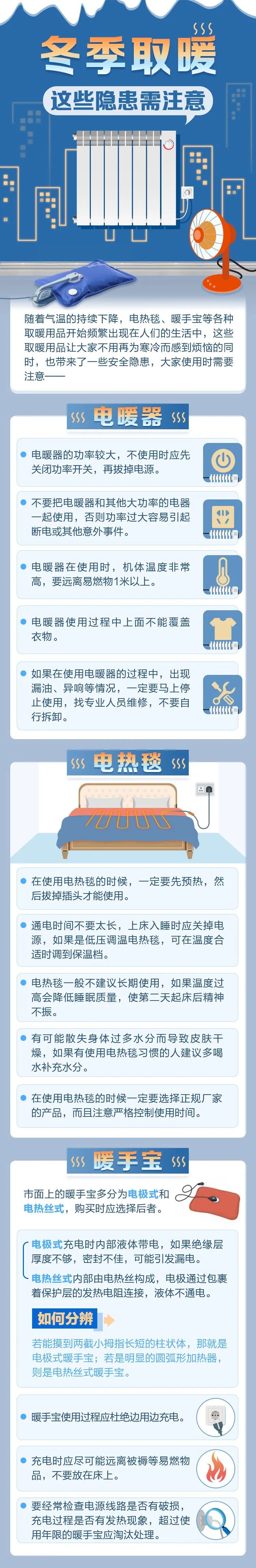 部分取暖电器如室内加热器、电热毯产品属于国家强制性产品认证,在购买时应认准3C强制性认证证书。水暖毯、暖手宝产品不属于国家强制性产品认证目录,购买时可优先选购有自愿性认证标志的产品。注意查看产品外观是否完整、使用说明是否齐备,保管好购买凭证和发票。