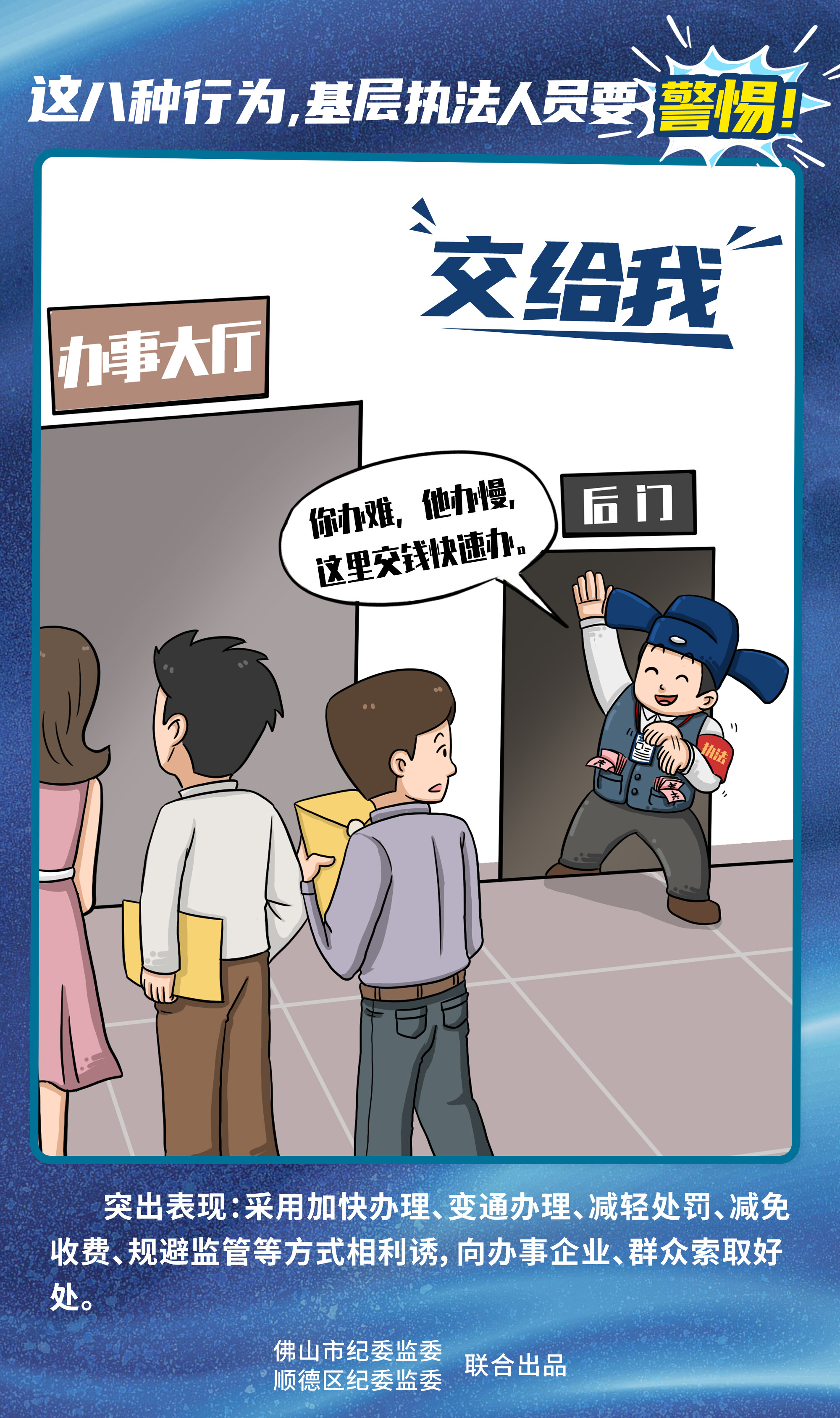 十九届中央纪委四次全会强调,要深入开展民生领域损害群众利益问题集中整治。近日,为推动落实“六稳”“六保”,佛山市、顺德区纪委监委先后对基层执法领域侵害企业和群众利益突出问题专项整治工作进行了部署。针对此次重点整治的不作为、慢作为、乱作为和以权谋私等侵害企业和群众利益的八大类问题,顺德区纪委监委牵头制作了专题漫画,提醒各位基层执法人员举一反三,引以为戒,积极主动为广大企业特别是民营企业健康发展保驾护航,为确保社会大局稳定提供坚强保障。