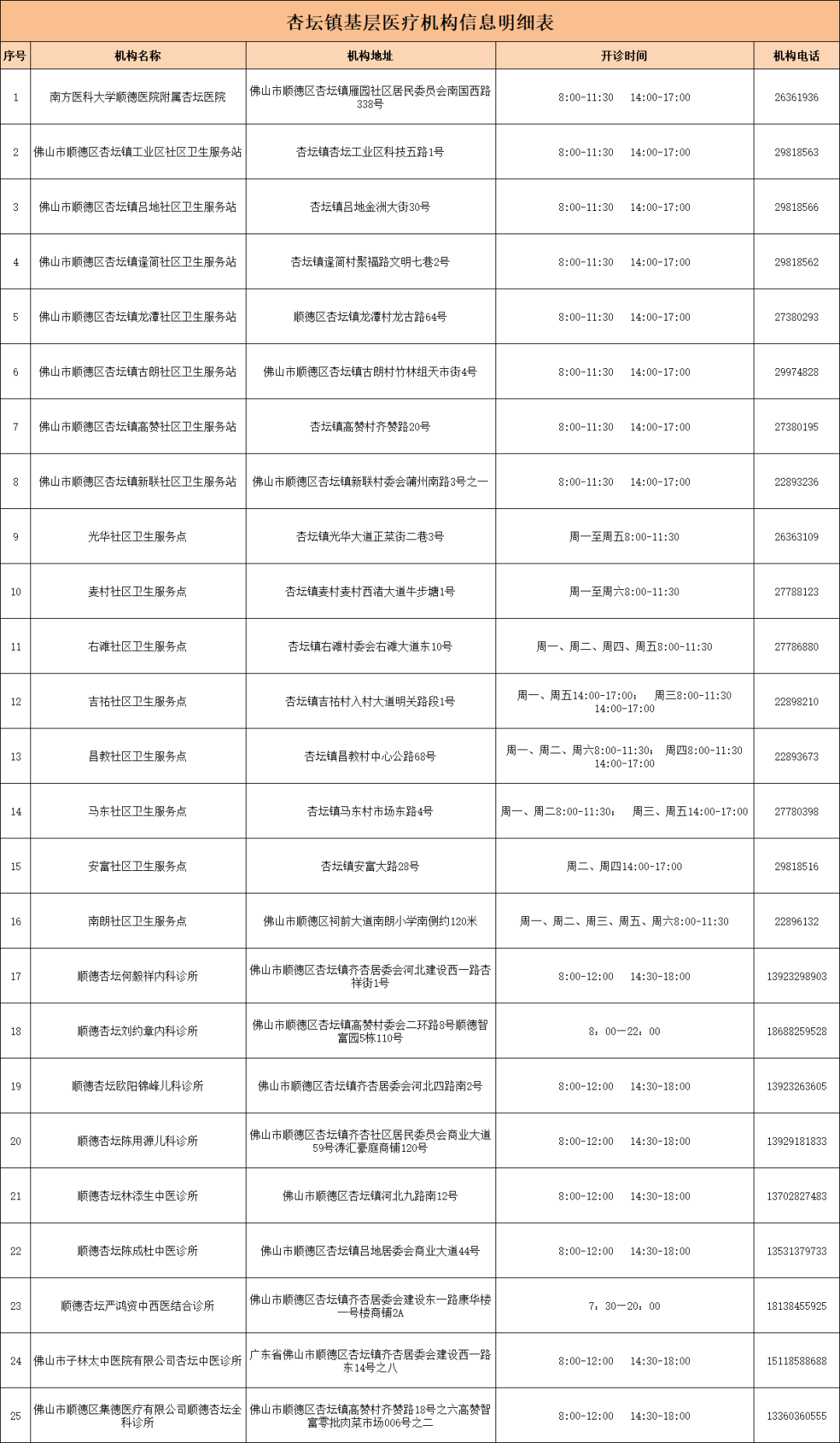 为避免聚集,满足群众就近就医需求,按照国家医疗救治相关政策,现公布杏坛镇范围内可以接诊发热及呼吸道症状的基层医疗机构的服务信息(详见附表)。