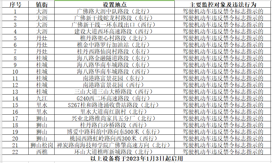 根据《中华人民共和国道路交通安全法》、《中华人民共和国道路交通安全法实施条例》、《道路交通安全违法行为处理程序规定》、《广东省道路交通安全条例》等相关法律法规的规定,现将第二批黑烟车抓拍点位进行公示,该批电子监控设备将于2023年1月3日开始对违反禁令标志指示等相关交通违法行为进行电子抓拍取证。排放黑烟等可视污染物的驾驶人,一经抓拍,将被处以罚款200元,驾驶证记1分。请广大车主和驾驶员自觉遵守交通法规,养成良好的文明交通出行习惯,共同营造安全、和谐、畅通的道路交通环境。