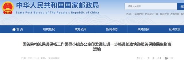 12月15日,国务院物流保通保畅工作领导小组办公室印发《关于进一步畅通邮政快递服务保障民生物资运输的通知》明确指出,各地物流保通保畅工作机制要全力打通邮政快递堵点卡点;要加强对当地邮政管理部门与相关部门的指导,统筹动员各方资源,细化入微各项举措,科学精准做好邮政快递保通保畅工作,保障邮件快件揽收投递顺畅,切实畅通邮政快递末端“微循环”。