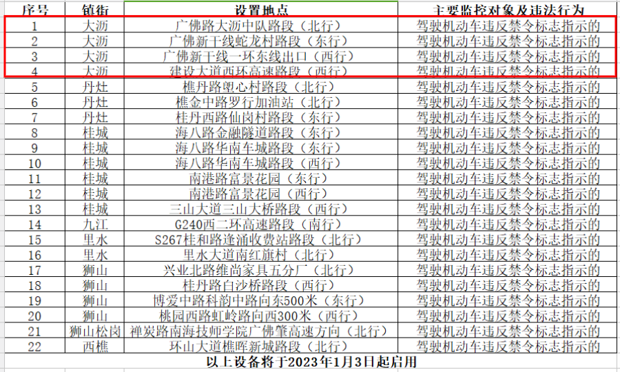根据《中华人民共和国道路交通安全法》、《中华人民共和国道路交通安全法实施条例》、《道路交通安全违法行为处理程序规定》、《广东省道路交通安全条例》等相关法律法规的规定,将南海区第二批黑烟车抓拍点位进行公示,该批电子监控设备将于2023年1月3日开始对违反禁令标志指示等相关交通违法行为进行电子抓拍取证。排放黑烟等可视污染物的驾驶人,一经抓拍,将被处以罚款200元,驾驶证记1分。