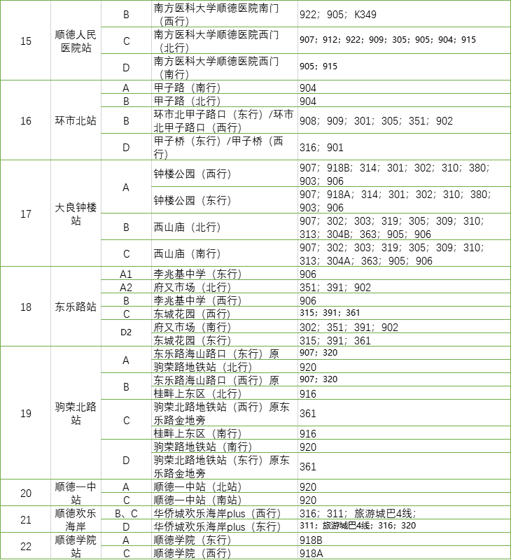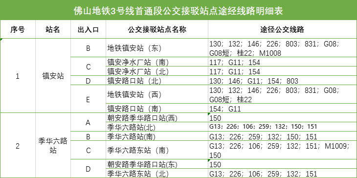 佛山地铁3号线首通段公交接驳站点途经线路明细表