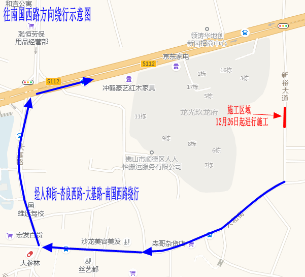 往杏良西路和人和街方向的车辆,可通过南国西路—大基路—杏良西路进行绕行。