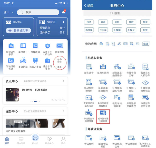 登录“交管12123”APP,点击【更多】进入【业务中心】,然后点击【城市货车通行码申领】,进入通行码页面。