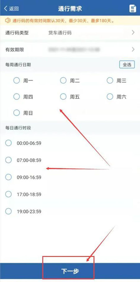 选择申领的通行码类型后,根据实际通行情况,录入通行时段需求。