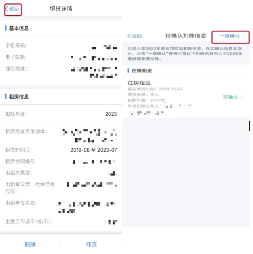 2023年专项附加扣除信息无变动的 ,只需在2022年基础上确认即可。核对信息无误后,点击“返回”—— “一键确认”。