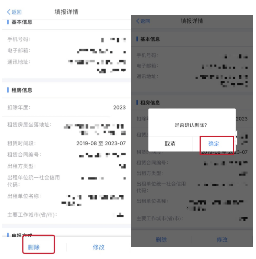 如:2023年不再享受住房租金专项附加扣除。在专项附加扣除信息界面确认界面,点击 “删除”——“确定”。