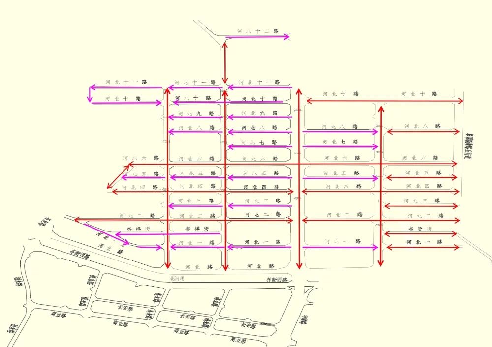 2.河北十路建设路以西段改单向西行,并两侧设置停车位;