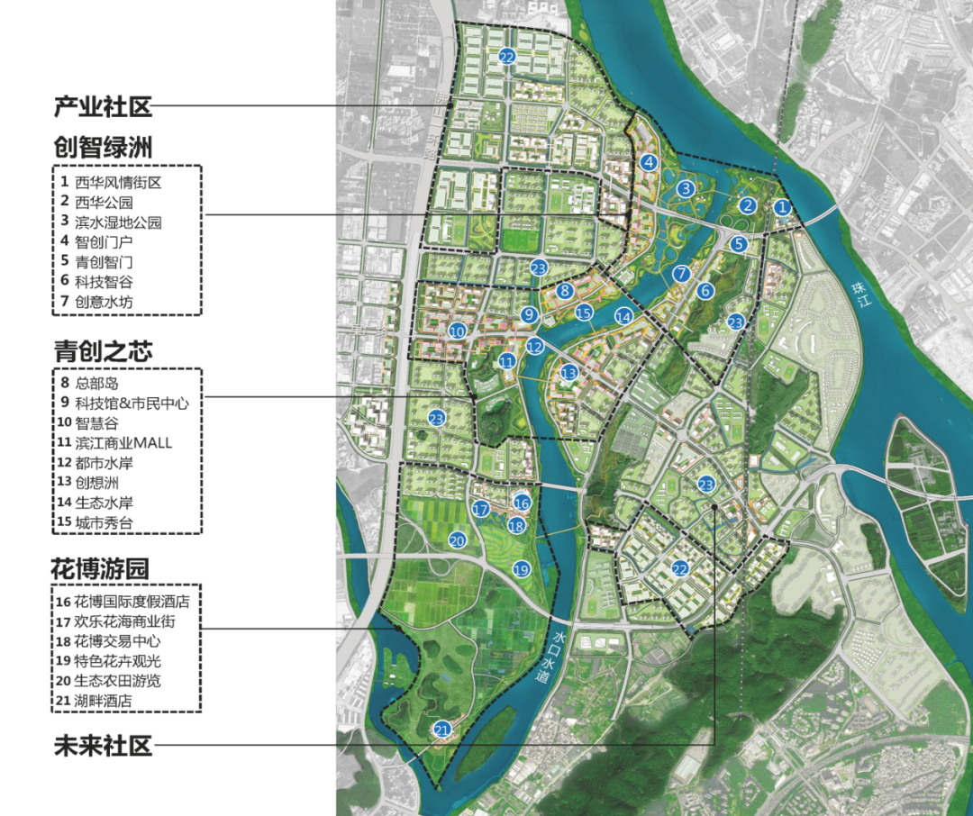 广佛青创城内分为产业社区、创智绿洲、青创之芯、花博游园、未来社区五个板块,其中,创智绿洲、青创之芯是重要节点。