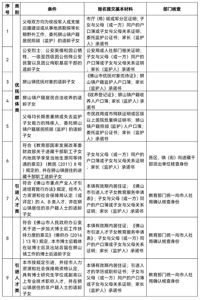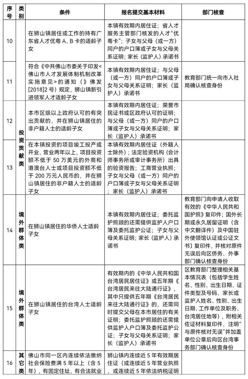佛山市同一区内连续依法缴纳社会保险费满5年以上(含5年),有固定住址、有合法就业或经营证明,且连续在狮山镇居住满5年以上(含5年)的非户籍人士的适龄子女。家长必须提供以下3份材料,缺一不可。
