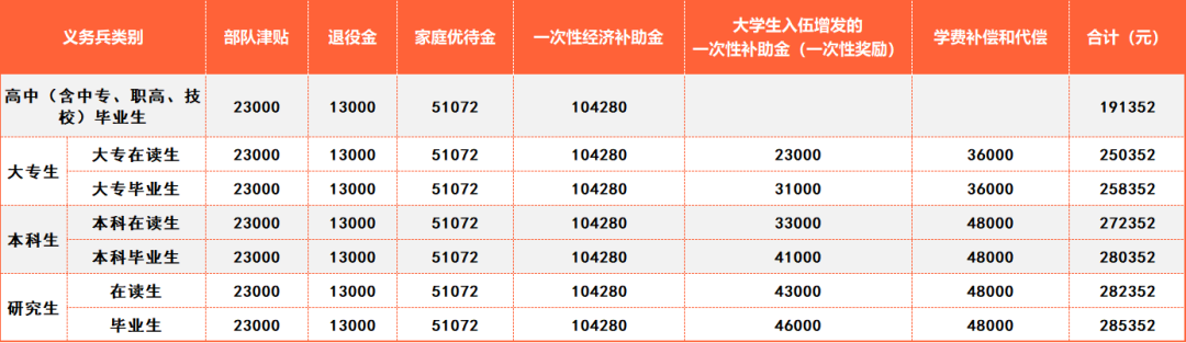 1.提高大学生入伍增发的一次性补助金。大专在读生每人2.3万元、应(往)届毕业生每人3.1万;本科生在读生每人3.3万元,应(往)届毕业生每人4.1万;研究生及以上在读生每人4.3万元,应(往)届毕业生每人4.6万元。