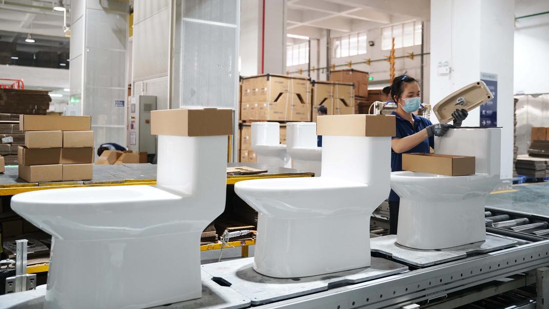 恒洁卫浴生产线,工作人员正在包装马桶。/佛山日报记者赖基润摄