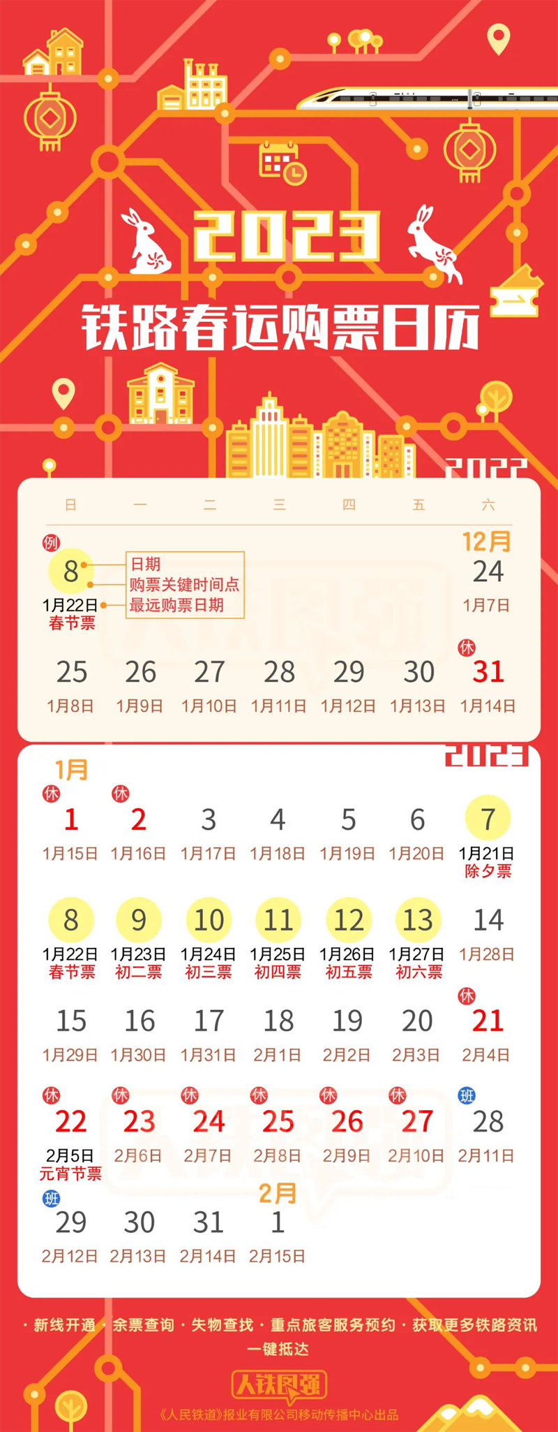 2023年春运火车票已于2022年12月24日正式发售。2023年铁路春运自1月7日开始,2月15日结束。购票日历请收好↓↓↓