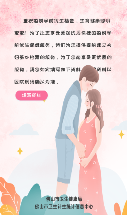 现在通过“佛山卫生健康”小程序就可以提前建婚检孕检档案,节省在服务机构等待时间。温馨提示:不是免费对象也可以通过小程序预先建档。