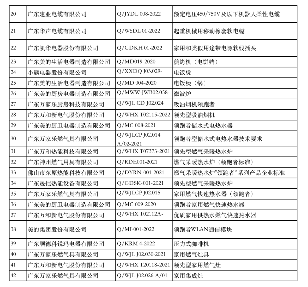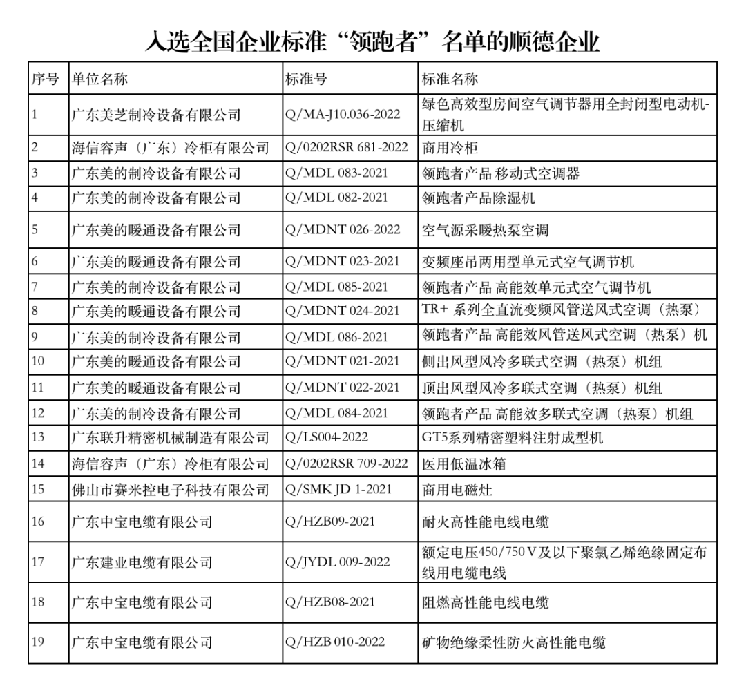 根据中国标准化研究院公布的2022年第一批企业标准“领跑者”榜单,广东美芝制冷设备有限公司、海信容声(广东)冷柜有限公司、广东美的制冷设备有限公司、广东美的暖通设备有限公司、小熊电器股份有限公司、广东万家乐厨房科技有限公司等23家企业的42项标准入选,入选的产品包括商业冷柜、除湿机、风管机、电饭锅、咖啡机、家用燃气灶具、移动式空调器等。其中,广东美的制冷设备有限公司、广东美的暖通设备有限公司等均有5项标准入选,成为入选标准最多的顺德企业。