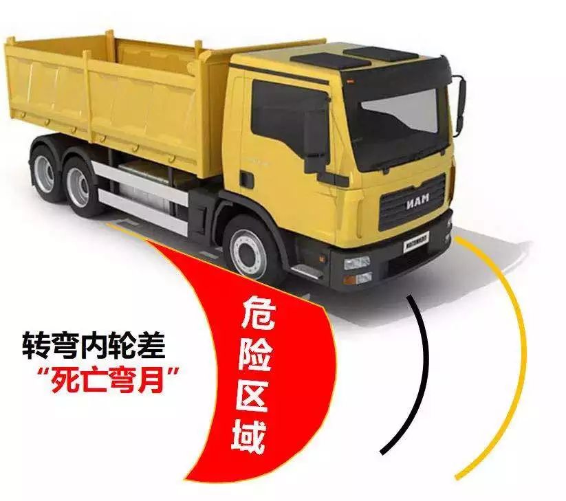 所谓“内轮差”,就是指车辆转弯时,前内轮转弯半径与后内轮转弯半径之差。由于“内轮差”的存在,大型车辆在转弯时,前、后车轮的运动轨迹不重合,会产生大面积的盲区。