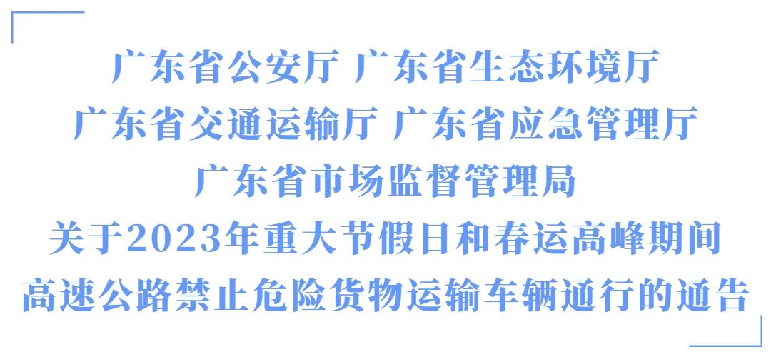 为加强危险货物运输车辆交通安全管理,保护人民群众生命财产安全和环境安全,确保2023年重大节假日和春运高峰期间全省高速公路交通安全畅通,依据《中华人民共和国道路交通安全法》《危险化学品安全管理条例》《道路运输条例》《危险货物道路运输安全管理办法》和《广东省道路交通安全条例》等有关法律法规,结合我省实际,省公安厅、省生态环境厅、省交通运输厅、省应急管理厅、省市场监管局决定,在重大节假日和春运高峰期间省内高速公路禁止危险货物运输车辆通行。现将有关事项通告如下。