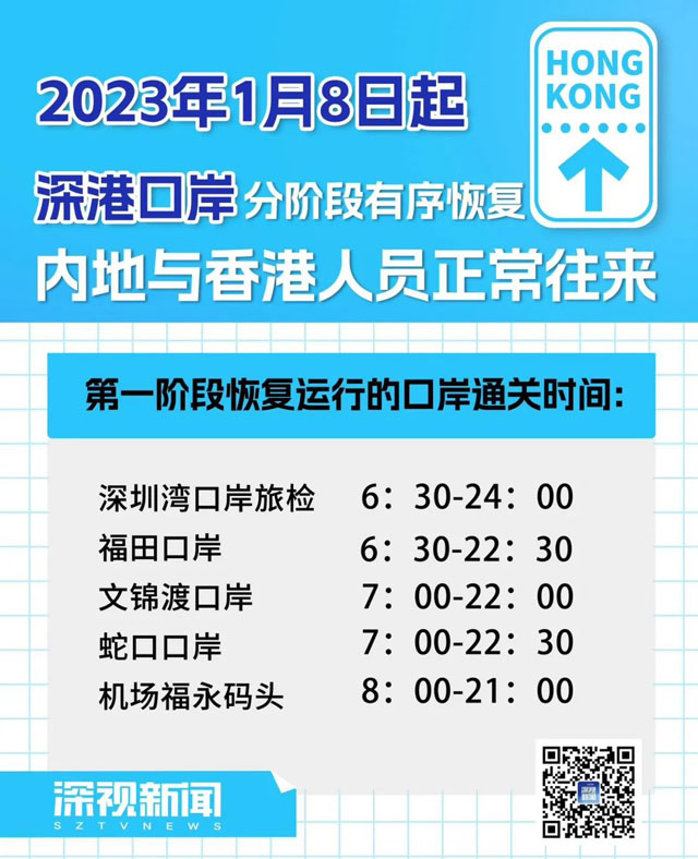 1月5日,国务院联防联控机制综合组发布通知,宣布自1月8日起实施优化内地与港澳人员往来措施。其中,包括“逐步有序全面恢复内地与香港、澳门陆路口岸客运和水路客运,为出入境人员快捷通关提供便利”等。