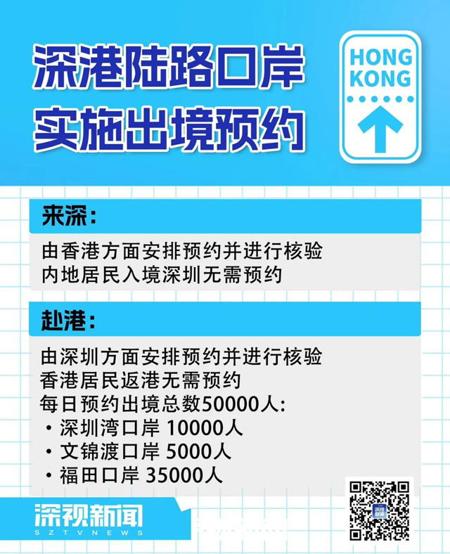 为确保过关安全、有序和畅顺,所有人士(北上前往内地的内地居民、南下前往香港的香港居民和经香港北上后返港的外地旅客除外)均须完成网上预约后,才能经上述三个陆路口岸过关前往内地或香港。所设每日单向人数限额为50000人(即深圳湾口岸10000人、文锦渡口岸5000人以及落马洲支线/福田口岸35000人);